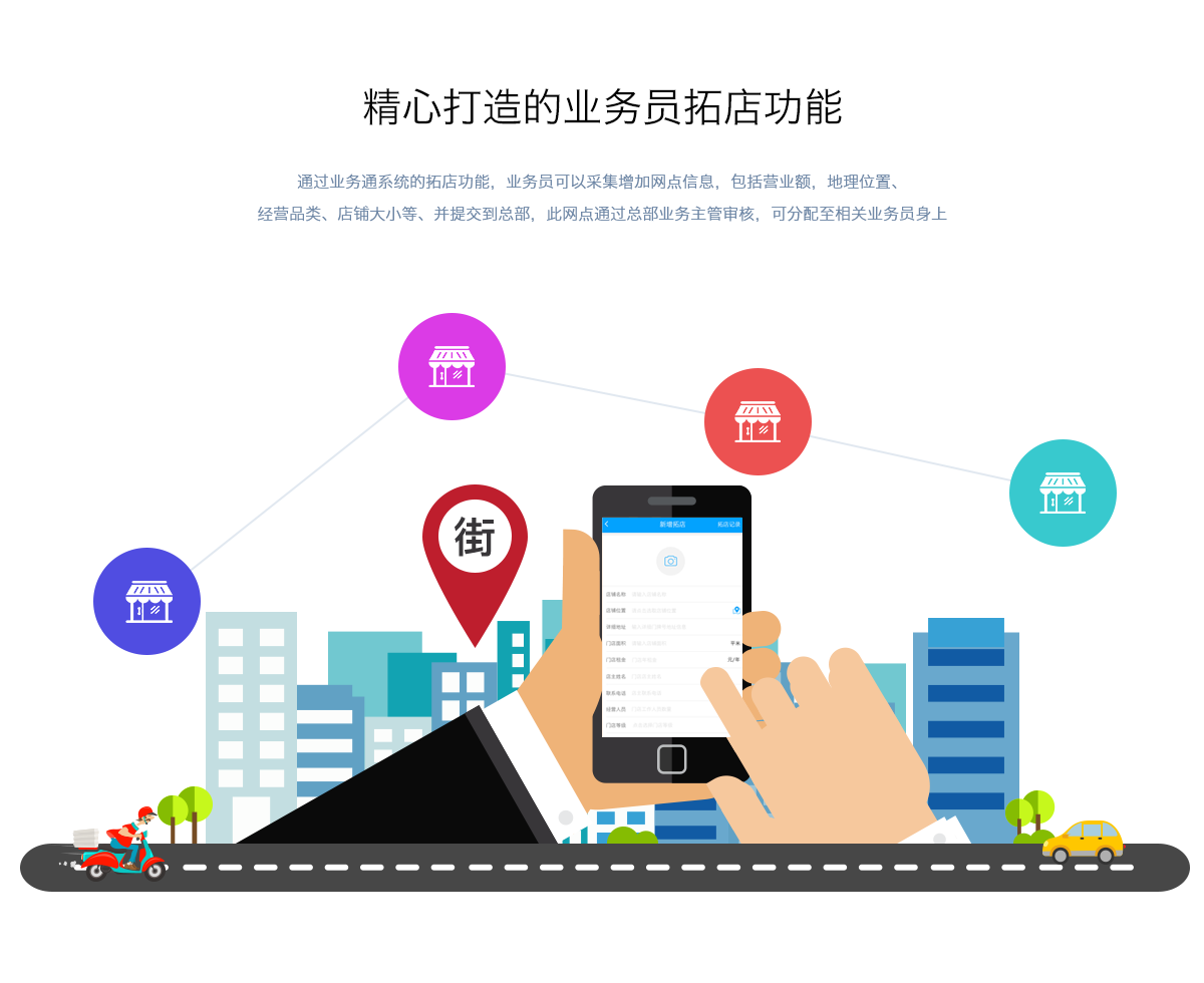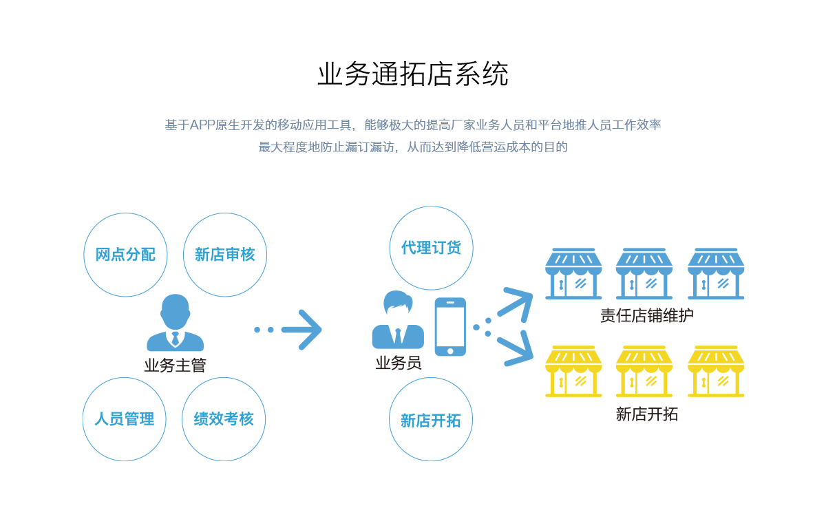 对于一个新的市场来说,开发新网点是非常重要的前期工作,通过业务通系统的拓店功能,业务员可以采集增加网点信息,包括营业额/地理位置/经营品类/店铺大小等、并提交到总部,此网点通过总部业务主管审核,可分配至相关业务员身上。