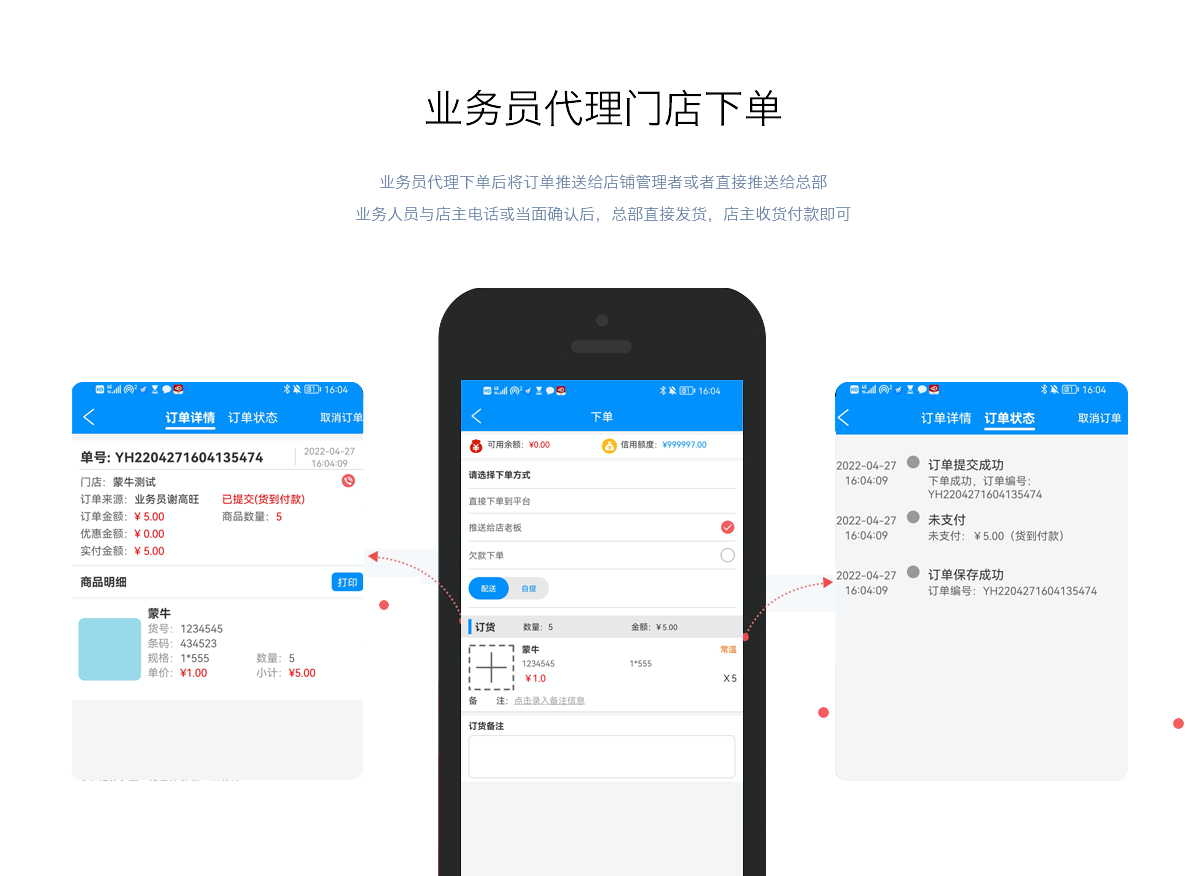 传统方式平台产品较多,价格经常变化,只依靠业务人员凭印象推荐,效率低、错误率高。通过使用业务通APP业务人员可以帮助门店进行订货。订货时可以看到平台发布的所有货品,还可参考该门店的订货偏好及平台主推商品,根据店铺商品销售/余缺数据进行订货。下单后还可将订单推送给店铺管理者,或者直接推送给总部,业务人员与店主电话或当面确认后,总部直接发货,店主收货付款即可。